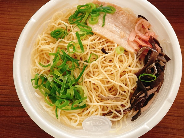 具材はきくらげ、ネギ、チャーシュー、紅生姜。きくらげ好きなので嬉しい。麺は細麺。スープの上にプラの蓋がありそこに麺と具材が乗っているセパレートタイプ。このままレンジで温めてていきます。