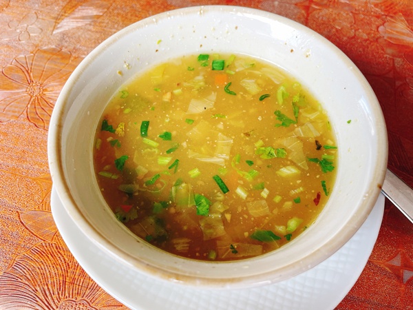 そして待っていると、なんと!お店のサービスでスープが!(通常はスープつかないので、こちらはご注意ください。)パクチーの入った少しスパイシーなスープでした。続いてサラダとオレンジジュース。サラダはインドカレー屋さんのサラダ!このドレッシング…インドカレー屋さんみんな同じの使ってるの???毎回謎(笑)でも好きなので嬉しい。