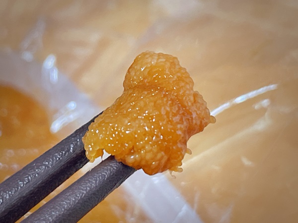 箸でちょっとつまんでみると、しっかり粒感がわかります。このままお酒のおつまみとして食べるのも美味しい。塩うにはねっとり濃厚が魅力なので、ほんの少しでも口の中にうにの香りが広がるのでちびちび楽しめる良い酒の肴となります。
